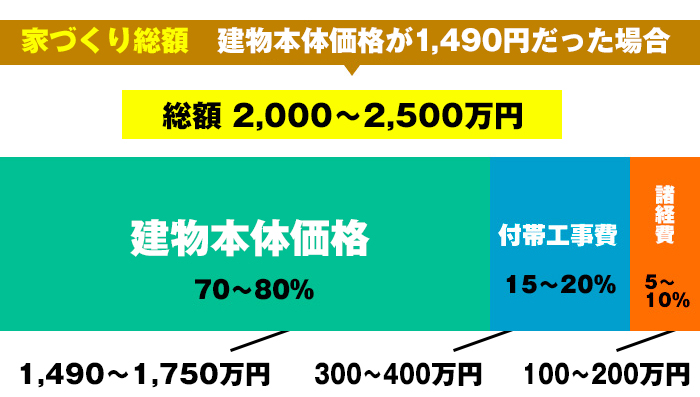 「建物本体」が1,490万円の場合 「建物本体」が1,490万円の場合、総額は2,000~2,500万円程度